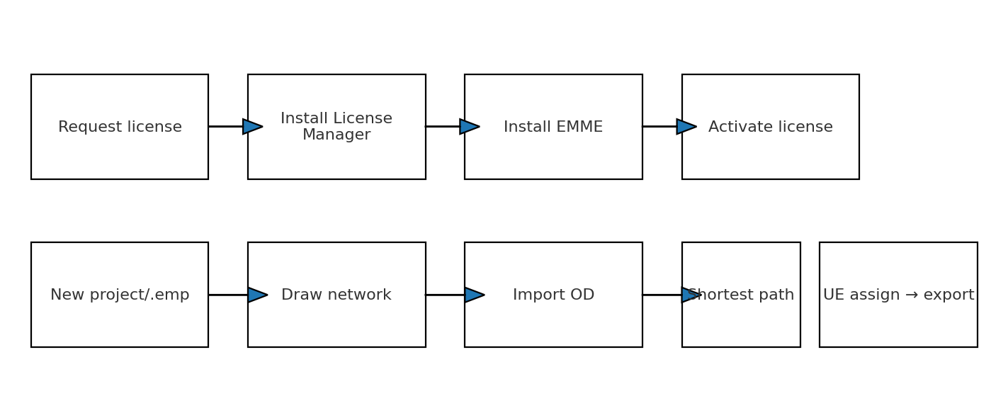 Goal: from zero to (1) a valid student/academic license, (2) EMME installed and activated, and (3) a tiny project that runs Shortest Path and User‑Equilibrium (UE) Assignment, then exports results. I’m keeping it practical and screenshot‑free so it works across versions.